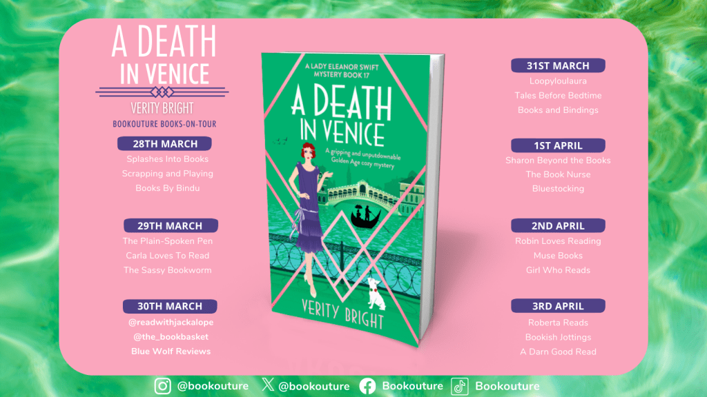 It has been a while since my last post and I apologise for not staying in touch – life has been busy and time sure does fly. I do hope you are all well though and having a good Easter weekend. Here in the UK spring is slowly emerging and there is a feeling of growth and renewal all around. It’s wonderful and I think one of my favoruite times of year. Today I am delighted to be taking part in the blog tour for the latest installment in the Lady Eleanor Swift Mysteries, A Death in Venice by Verity Bright. So let’s find out a little more about the book…